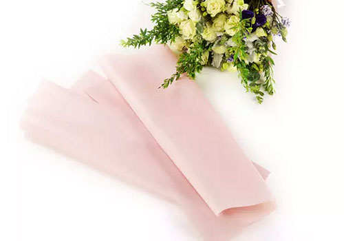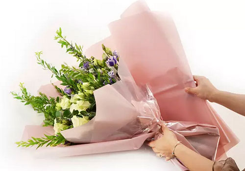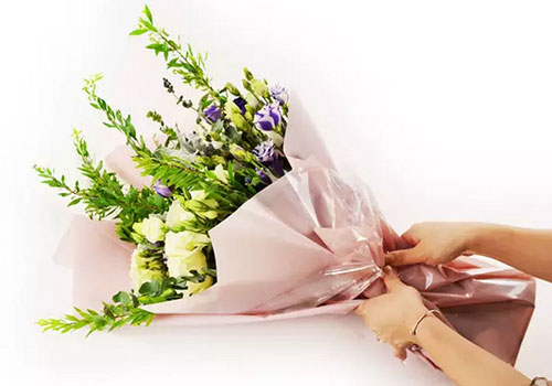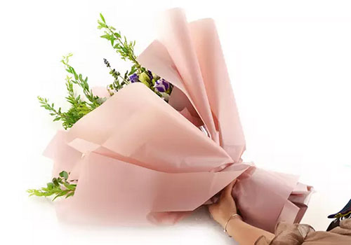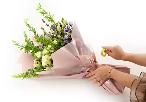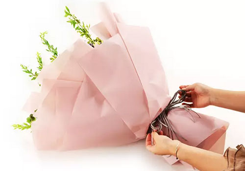 第二步:用韩素纸在鲜花的花茎上包上一层,然后再用玻璃纸做好防水,放在交叠在一起的包装纸上,然后把花束两侧的包装纸向上折起,握紧。