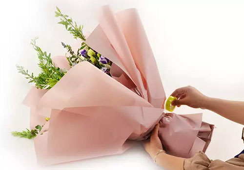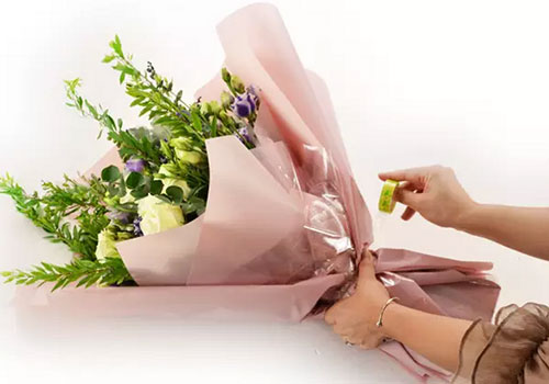 第五步:把韩素纸握紧在花束上,调整好角度和抚平褶皱,用胶带缠紧。