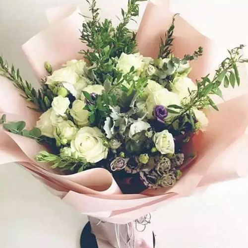 以淡绿色玫瑰花搭配各种绿色系配花作为花材,但包装纸却使用藕粉色的韩素纸。两种颜色,不仅不会让花束变得单调,反而多了一种视觉对比产生的美感。既有小清新的唯美,又有少女心的梦幻。