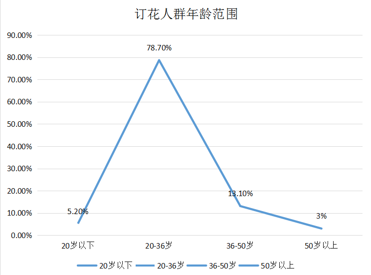 20-36岁年龄段仍然是鲜花消费的主力人群,占到总数的78.7%。这个人群就是80后到95前,他们的购买力是最强的,他们有一定的经济能力,享受生活、爱浪漫。19岁以下的人群占5.2%,36-50岁人群为13.1%,50 岁以上的人群鲜花购买力占比较低,只有3%。“5.20”期间也有约3%的女性订花送给男性。