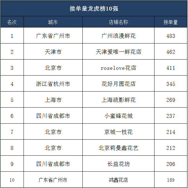 来自广东省广州市的广州浪漫鲜花荣登接单量龙虎榜榜首,天津爱唯一鲜花店和北京roselove花店荣膺榜眼和探花。