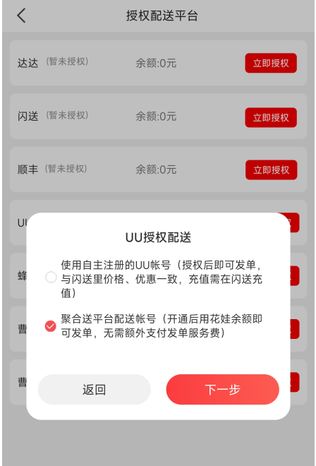 第三步:授权配送服务(自有配送账号/花娃聚合账号)