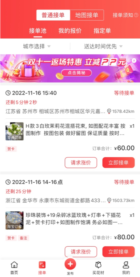 开通优先抢单服务可快速抢单。优先抢单是属于花娃的增值服务,公司购买独立服务器设备,实现订单推送无延迟,开通后可享受订单优先推送,提升订单的抵达率,您可优先选择高价单。