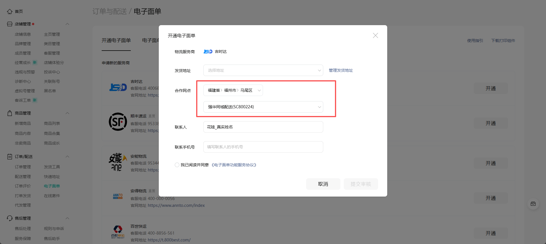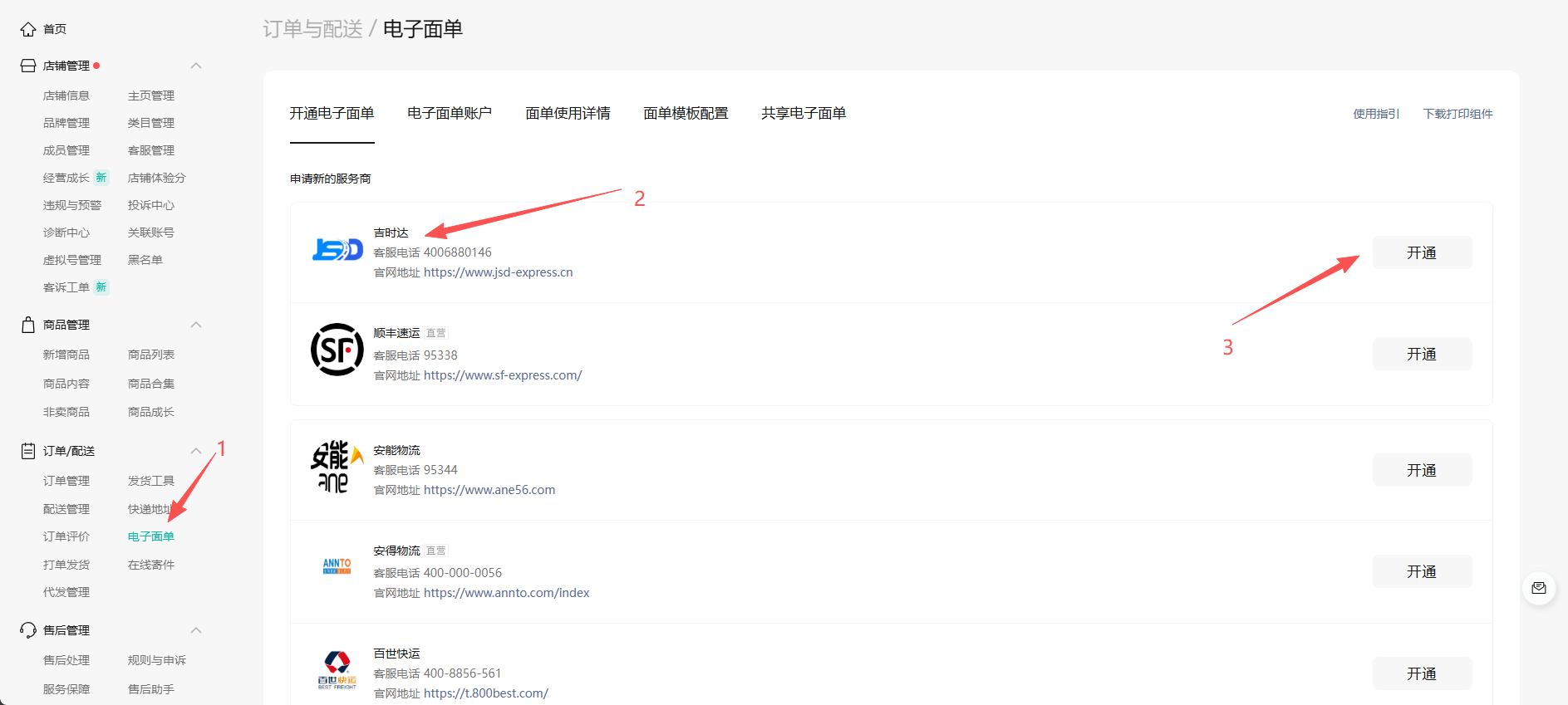 2.登录电脑端微信小店后台,点击左侧【订单/配送】-【电子面单】,选择开通吉时达物流。