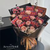 【做好看照片!!花花要开的!!】 11朵香槟玫瑰,搭配情人草,如图包装,透明雾面纸和粉色包装纸搭配。保证新鲜和质量