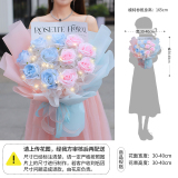1: 5枝粉玫瑰,6枝碎冰蓝玫瑰(玫瑰均单独加白色浪花纱),1条灯串,5颗珍珠,包装:白色英文纸、粉色韩素纸、蓝色韩素纸 ,购买数量:1 ,图片数量:2