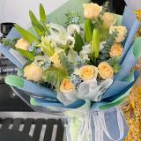 1: 【做好回图看一下再送】11朵香槟+6朵白百合花束+蓝星花+喷泉草+尤加利叶+灯串下插花泥+贺卡打印+如图制作饱满 务必如图一制 拍照留底(没有备注贺卡内容就不用加) ,购买数量