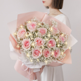 1: 11枝粉佳人粉玫瑰搭配白色满天星、1条小串灯,包装:白色雪梨纸搭配双色欧雅纸 ,购买数量:1 ,图片数量:1