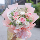 1: 3枝粉雪山玫瑰搭配1枝白桔梗,1枝粉色多头玫瑰,白色满天星,尤加利叶,包装:白色棉纸,网红英文纸搭配粉色韩素纸 ,购买数量:1 ,图片数量:1