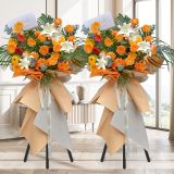1: 2个三脚架开业花篮如图制作,单个花篮不少于30只橙色弗朗花+百合花+4支粉色弗朗花如图制作。 ,购买数量:2;