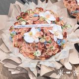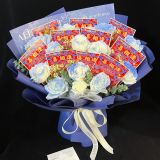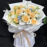 1: 如图花束:11朵香槟玫瑰+不少于如图数量白色桔梗+蓝星花+绿铃草,下插花泥,包装和丝带按图搭配制作,请按图搭配饱满,拍照回传 【花枝不要剪太短,配花务必足量,按图插丰满中间不要有