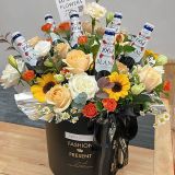 彩灯 1朵向日葵 5朵香槟玫瑰 橙色泡泡 尤加利 橙色泡泡 花材饱满 如图包装#