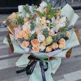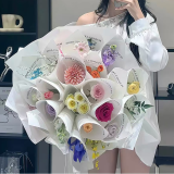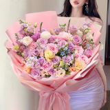 1: (高度不低于70厘米 )19只紫玫瑰+9只粉色系玫瑰+3只紫罗兰+蓝星花+洋桔梗花如图制作,高度不低于70厘米。 ,购买数量:1;