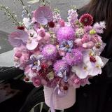 1: 2紫掌颜色如图 4小牡丹菊如图一致 4白色蝴蝶兰鲜花喷色 3吸色郁金香 粉绣球 2深色大丽花如图 25紫玫瑰颜色品种如图 深红色松虫草 浅紫色洋桔梗 紫罗兰 白罗兰