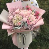1: (确定好时间再送)2朵粉色绣球花,19朵粉佳人,搭配粉色乒乓菊,粉色桔梗,粉色满天星。按图做好,送到拍照 ,购买数量:1;