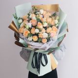 7枝白玫瑰+4枝粉玫瑰,搭配情人草 满天星、栀子叶。花材务必新鲜 做好请回传图片 谢谢