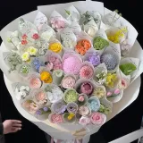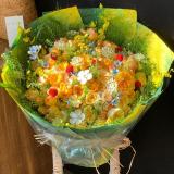1: 奶油杯,果汁阳台,千日红,蓝星花,跳舞兰,喷泉草,翠竹,永生紫罗兰,如图包装制作,花材新鲜开放,花束饱满大气 ,购买数量:1;