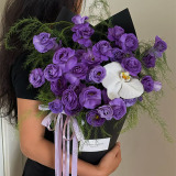 1: 手提袋 白色蝴蝶兰 2紫色牡丹菊如图 大飞燕 紫罗兰 15曼塔喷色 2吸色郁金香 雪柳 紫色配花如图 白色风铃花 翠珠 其它花材如图 如图制作包装 直径不小于