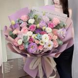 1: 10朵粉雪山+4朵紫霞+3朵紫精灵2支喷泉草+如图足量饱满白桔梗+洋桔梗(农民紫或丁香紫)【没有洋桔梗就用白桔梗喷色】+蓝星花+折射+尤加利叶。【不要子弹头】如图务必花材一致