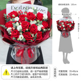 1: (热销主推品,确保质量)11枝卡罗拉红玫瑰、4枝白桔梗、4枝红豆、尤加利叶+一条灯串(请务必保证花材新鲜,包装大气,感谢!);(请赠送一张贺卡!),包装:白色简约英文纸、红色圆心网、双色