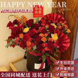 1: 按图还原,贺卡如图,花材:19朵红玫瑰+10朵红色康乃馨+4朵香槟玫瑰+3个如图红色折扇+足量多头红色康乃馨+橙色泡泡+红豆+尤加利+黑色抱抱桶,如图包装丝带,包装大束一点,按图制作