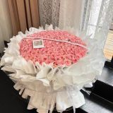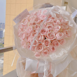 1:52朵粉雪山玫瑰+珍珠点缀+白色蝴蝶结+白色丝带+最外层透明包装,购买数量:1;