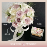 1: 4枝曼塔玫瑰,3枝海洋之歌玫瑰搭配2枝浅紫紫罗兰,2枝蓝星花,2枝白桔梗(分别喷丁香紫和薄雾紫漆),1张英文卡片(样式随机),5颗珍珠;(贺卡字好看些哦!),包装:浅紫色棉纸,紫色花卉氛围