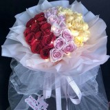 1支粉色绣球+19朵粉紫玫瑰大花束+白桔梗、蓝星花、翠珠、折射泡泡、尤加利 一切如图制作,如图包装,做好留图(花束直径40cm左右的 大气花束)
