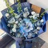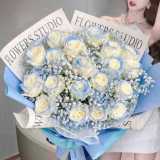 1: 赠手提袋 2浅蓝色绣球如图 白色蝴蝶兰喷色 11白玫瑰喷色 白色洋桔梗喷色 蓬莱松喷色 大飞燕 蓝星花 其它花材如图 花材新鲜饱满 如图制作包装 直径不小于50 ,购