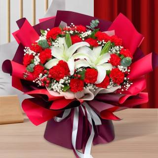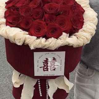2束 图1:33朵红玫瑰花束 +如图布艺包装+如图喜字+ 如图包装纸丝带 按图包装,搭配丰满,用花泥插,回图, 图2:【+灯串】如图花束:2支白色多头百合(2朵开放的)+19朵红色康乃馨+足量(红豆+白色满天星+尤加利叶)+下插花泥+如图包装纸丝带+按图制作饱满大气+做好拍照留底回图【花枝不要剪太短】