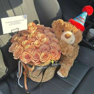 如图抱抱桶,21朵卡布奇诺玫瑰+泰迪熊+如图帽子,下插花泥,包装和丝带按图搭配制作,请按图搭配饱满,拍照回传【花枝不要剪太短】