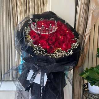 【送之前联系好】33朵红玫瑰花束 x+皇冠+彩灯+白色满天星丰满到诶+黑色包装纸+黑纱盖头拖长尾包装:按图包装制作大气丰满,做好及时上图。 请用新鲜花材,保证质量,送之前联系好收货人